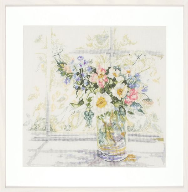 The lanarte bouquet of flowers PN-0168743 is a mixed array of both wild and home flowers placed together in a clear glass jar and then positioned on a windowsill with the sun streaming in behind. The picture is both delicate and light and stitched using two strands through out.